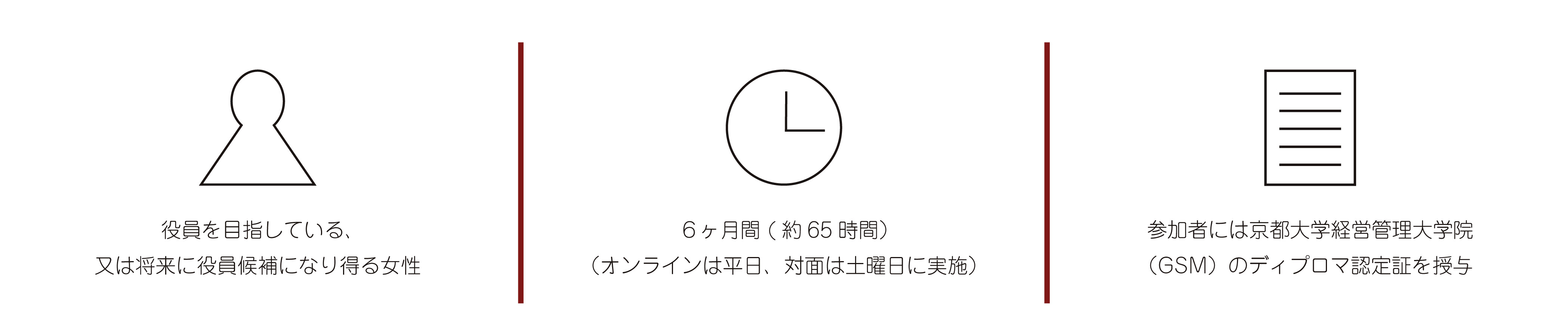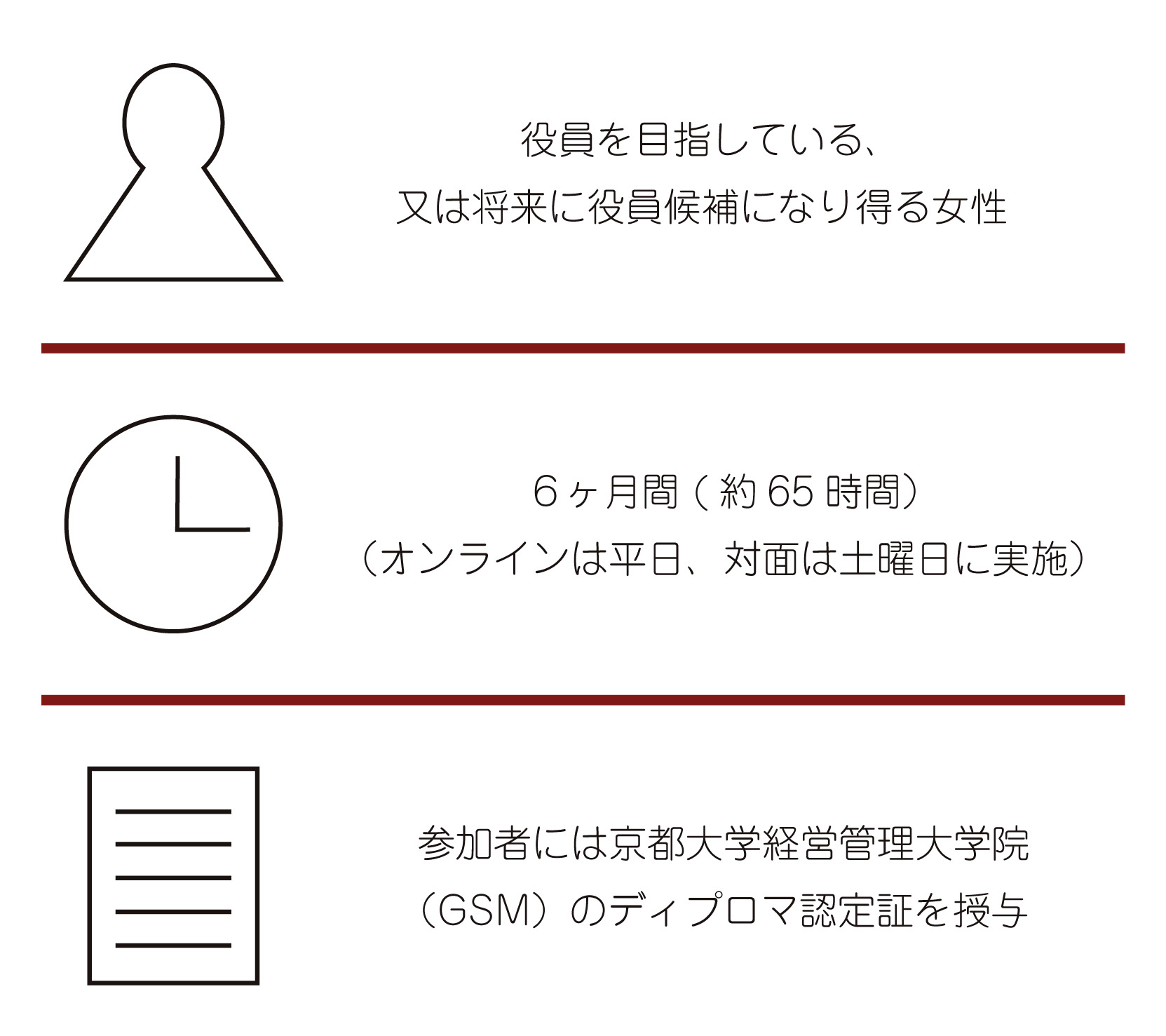 また、京都大学経営管理大学院(GSM)の教授陣に加え、主に女性経営者、コンサルタント、その他様々な専門家とのネットワーキングを通じて参加者の将来のキャリア形成を支援します。